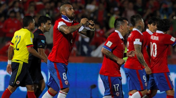 Мачът започна с пропуск на Алексис Санчес. Нападателят на Арсенал изскочи на добра позиция, но съотборникът му при "топчиите" Давид Оспина спаси. Чилийците продължиха да са по-добрият отбор на терена и заслужено поведоха в 45-ата минута. Тогава Матиас Фернандес центрира, а неособено високият Артуро Видал се ориентира най-бързо в наказателното поле и с глава откри резултата.