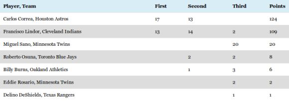 Вотът в НЛ бе далеч по-оспорван и 21-годишният пуерториканец Кореа спечели благодарение на 17 първи и 13 втори места (128 т.) срещу 13 първи, 14 втори и 2 трети места за неговия сънародник и колега по пост в Кливланд Индиънс Франсиско Линдор (22 г.), който със 109 т. остана втори в крайното класиране. Трети е доминиканският DH на Минесота Туинс Мигел Сано (22 г.) с 20 т.