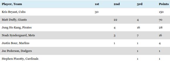 В анкетата на асоциацията на бейзболните журналисти в Северна Америка (BBWAA) 23-годишният Брайънт събра максимално възможните 150 т. по системата 5-3-1 от първо до трето място, след като бе посочен за победител от всички 30 участници. Втори се нареди третият бейзмен на Сан Франциско Джайънтс Мат Дъфи (24 г.) със 70 т., а трети е корейският шортстоп на Питсбърг Пайрътс Кан Джун-Хо (28 г.) с 28 т.