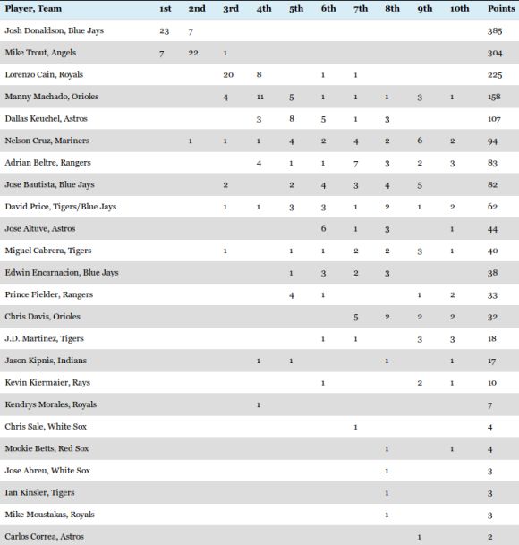 Победителят във вота за АЛ Доналдсън пък събра 385 т. от 23 първи и 7 втори места и така изпревари двама централни аутфилдери – Майк Траут от Лос Анджелис Ейнджълс (304 т.) и Лоренцо Кейн от шампиона Канзас Сити Роялс (225 т.).