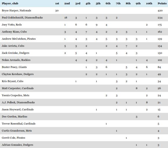 Харпър, който отпразнува 23-тия си рожден ден на 16 октомври, бе посочен на първо място от всички 30 журналисти, участващи в анкетата на северноамериканската ресорна асоциация (BBWAA), и събра максимално възможните 420 т., разпределяни по системата 14-9-8-7-6-5-4-3-2-1 до 10-о място. Втори и трети се наредиха двама първи бейзмени – Пол Голдшмит (Аризона Дайъмъндбекс) с 234 т. и Джоуи Вото (Синсинати Редс) със 175 т.