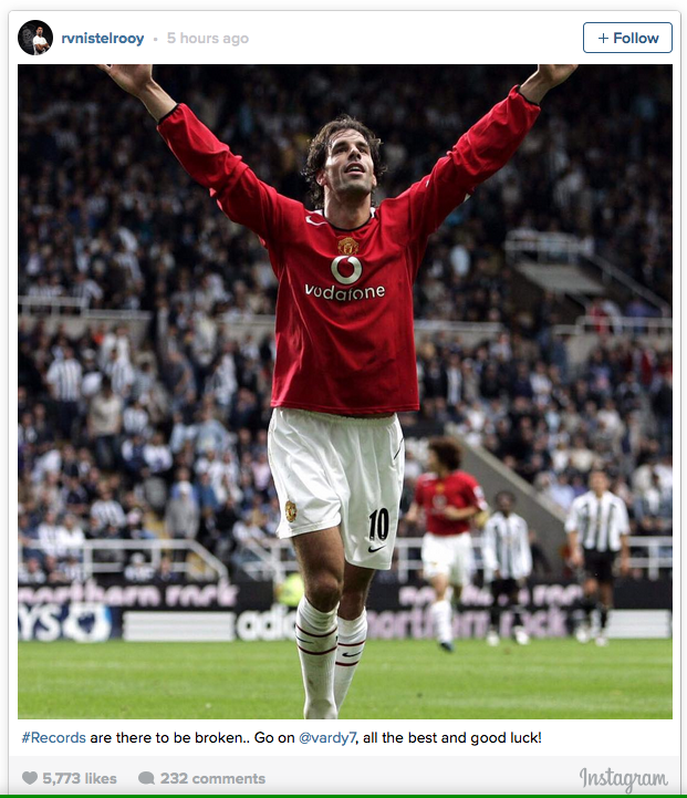 Ван Нистелрой постави своя рекорд през далечната вече 2003 година. Вместо да се притеснява за това, че може да не е единственият в историята с голове в десет поредни мача, бившият голмайстор №1 на английския шампионат публикува специално съобщение в социалната мрежа "Инстаграм" към Джейми Варди.