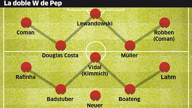 Но да се върнем на Пеп и неговата версия. Срещу Олимпиакос той пусна Ариен Робен и Кингсли Коман като крила, Дъглас Коща и Томас Мюлер като инсайд нападатели и Роберт Левандовски като „деветка”… с Артуро Видал като опорен халф! Схема, която няма нищо, ама нищо общо с онази с петимата централни полузащитници (Серхио Бускетс, Чави, Андрес Иниеста, Тиаго Алкантара и Сеск Фабрегас) зад Лионел Меси като „фалшива деветка”, видяна на финала на световното клубно първенство срещу Сантос. Да припомним, че именно този мач и тази схема Пеп смята за своя шедьовър в „асулграна” ерата си.
