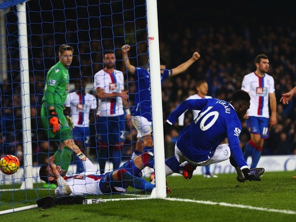 Първата интересна ситуация на "Гудисън Парк" създадоха гостите, но Тим Хауърд пресече опасното центриране на Яник Боласие към Конър Уикъм. Последва удар в гредата на Лукаку, който непрестанно тормозеше защитата на Кристъл Палас. Жерард Деулофеу и Рос Баркли също бяха много активни, но почивката дойде при нулево равенство.
