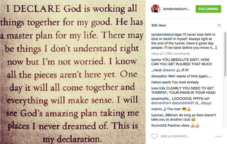 Нападателят на Ливърпул Даниел Стъридж, който стана обект на редица коментари от страна на феновете заради поредната травма, която получи, публикува обръщение в социалната мрежа "Инстаграм" за своята травма. 26-годишният нападател, за когото това е седма контузия в рамките на последните 18 месеца, обеща, че ще се върне на терена още по-силен и намекна, че това "ще е по-скоро, отколкото очаквате".
