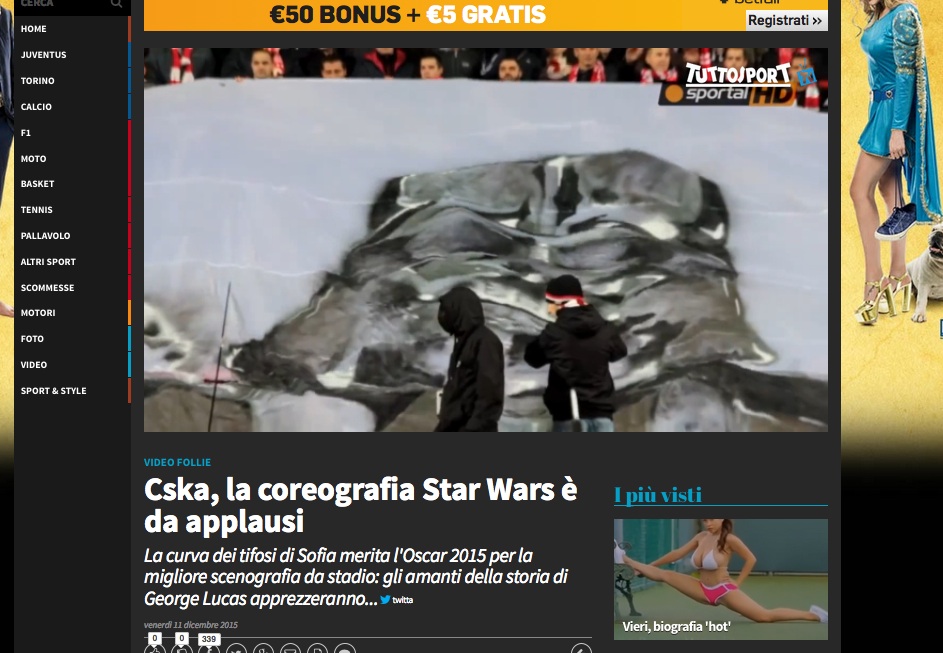 "Вярната трибуна с фенове на ЦСКА заслужава да получи Оскар за 2015 г. за най-добрата хореография. Любителите на поредицата на Джордж Лукас ще я оценят", пишат на Апенините.