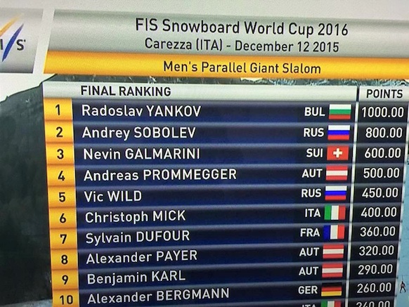 Българинът Радослав Янков спечели първа победа за Световната купа по сноуборд. 25-годишният Янков беше най-бърз в паралелния гигантски слалом в италианския зимен център Кареца. На финала българинът се справи със световния първенец в дисциплината Андрей Соболев от Русия. Трети завърши олимпийският вицешампион Невин Галмарини (Швейцария), следван от Андреас Промегер (Австрия) и от олимпийския златен медалист от Сочи 2014 Вик Уайлд (Русия).
