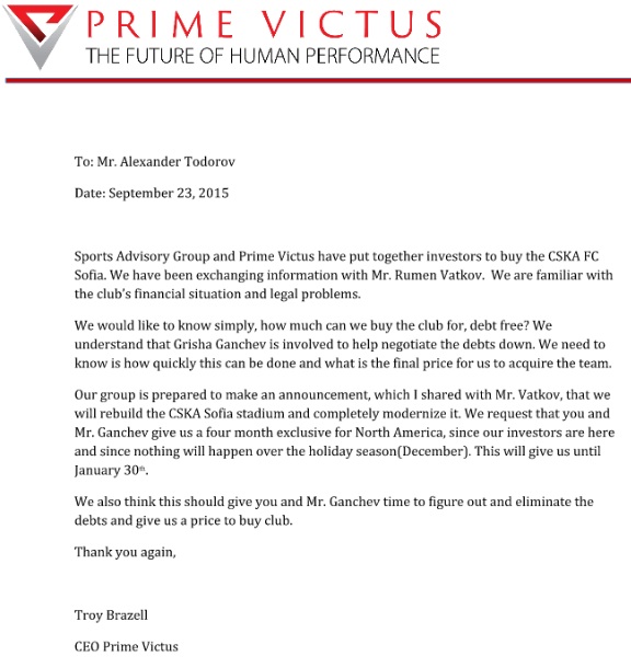В интервю за Sportal.bg американецът Трой Брейзел обяви, че разполага с инвеститори, които искат да купят ЦСКА. Бизнесменът говори и за писмо, което е изпратено в канцелариите на "Армията". Ето какво пише в него: