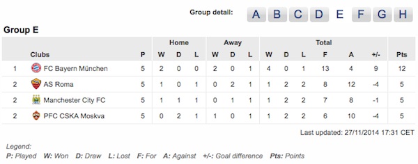 "Ако преди изиграването на всички мачове два или повече отбора имат равен брой точки, те се подреждат по азбучен ред. В случая на второ място е Рома (AS Roma), трети е Манчестър Сити (Мanchester City FC), a четвърти - ЦСКА (PFC CSKA Moskva)", заявиха от УЕФА.
