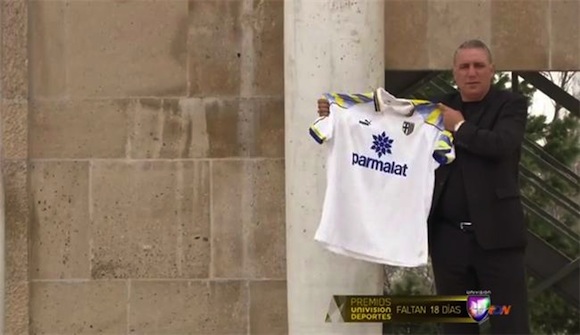 Явно това място му е донесло най-щастливият момент. Той показва екипите на някои от отборите, в които е играл, и разказва за тях.