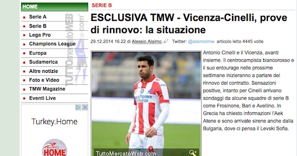 Левски проявява интерес към полузащитника на Виченца Антонио Чинели, пише италианският сайт Tuttomercatoweb.com. "Сините" искат да се възползват от факта, че договорът на футболиста изтича в края на сезона. В същото време обаче ръководството на настоящия му клуб иска да го задържи и затова за идните седмици е планирана среща, на която двете страни ще обсъждат параметрите на евентуалния нов контракт.