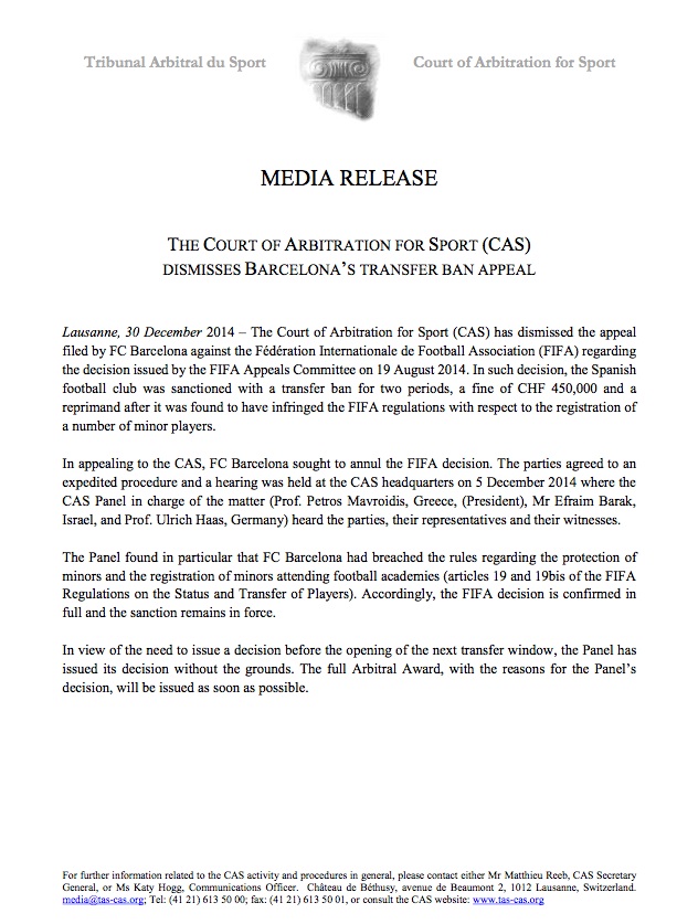Съдът отхвърли като неоснователно искането на "лос кулес" за отмяна или намаляване на ембаргото. На 2 април 2014 година Дисциплинарният комитет към ФИФА излезе с решение да санкционира Барса заради "груби нарушения на правилата за привличане на чуждестранни футболисти под 18 години".