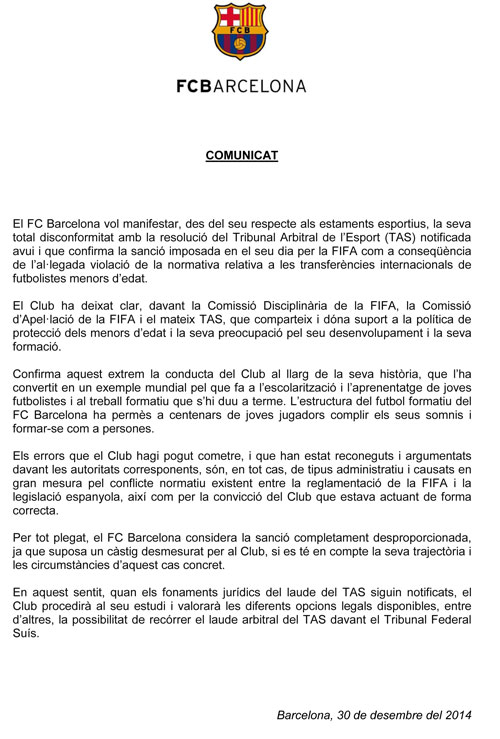 Ръководството на Барселона посрещна с "пълно неодобрение" решението на Спортния арбитражен съд в Лозана, който потвърди наказанието, наложено от ФИФА поради нерегламентираното привличане на непълнолетни футболисти. "Клубът е показал явно… че подкрепя и съдейства на политиката за защита на подрастващите футболисти. (…) Структурата на детско-юношеската подготовка на ФК Барселона позволи на стотици млади играчи да сбъднат мечтите си и да се формират като личности", се казва в съобщението, разпространено от каталунския клуб.