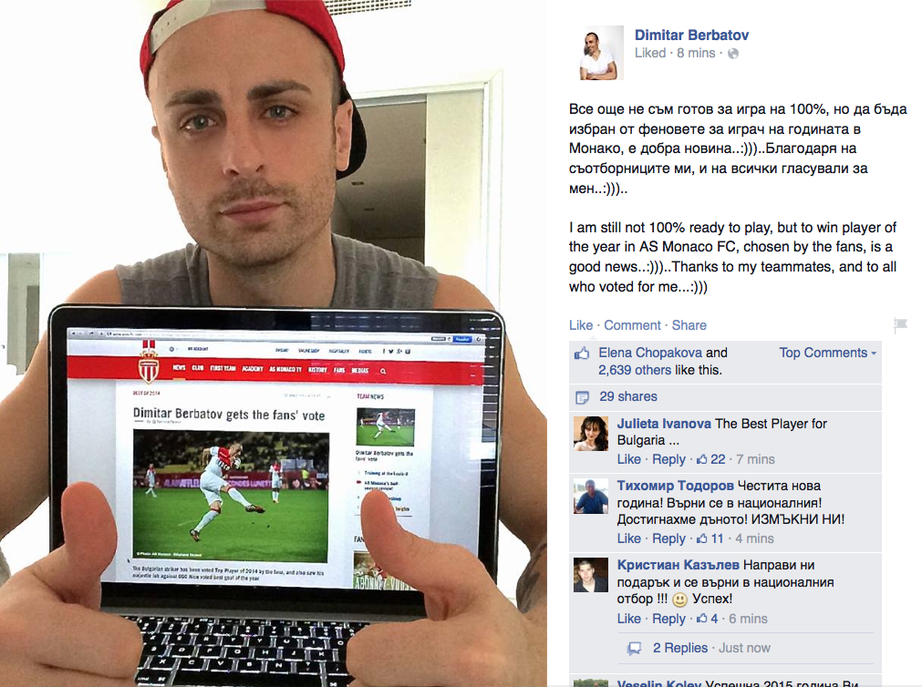 Нападателят на Монако Димитър Бербатов изрази благодарността си към феновете на отбор, които го избраха за играч на годината на монегаските. Бербо използва страницата си във Фейсбук, за да изкаже задоволството си от признанието. Митко също така сподели, че все още не е напълно възстановен от контузията си и все още не е на линия за игра.