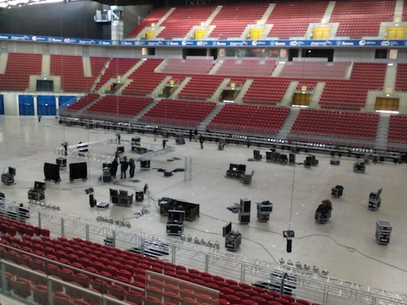 Изграждането на съоръженията за провеждането на грандиозното мотоциклетно шоу Фрийстайл Суперфинал Голдън Къп "Нощта на скоковете" в софийската зала "Арена Армеец" стартира днес. Събитието ще се проведе на 10 януари. В ранните часове на деня започна работата в залата, като една от първите задачи беше поставянето на основите на бъдещите боксове за моторите на участниците.
