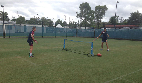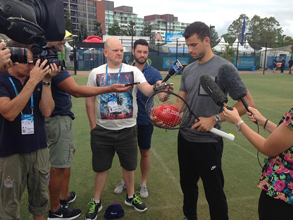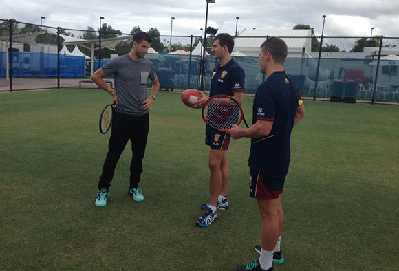 Световният номер 11 Григор Димитров остави за кратко тенис ракетата и опита възможностите си в австралийския футбол. Непосредствено след класирането си за 1/2-финалите в надпреварата на двойки в Бризбън заедно с партньора си Танаси Кокинакис българинът се срещна с играчите Brisbane Lions Сам Мейс и Дейн Зорко.