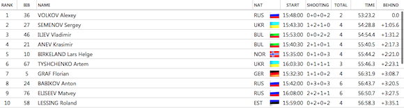 1. Алексей Волков (Русия) - 53:23.2 минути (0+0+0+2 грешки при стрелбата)