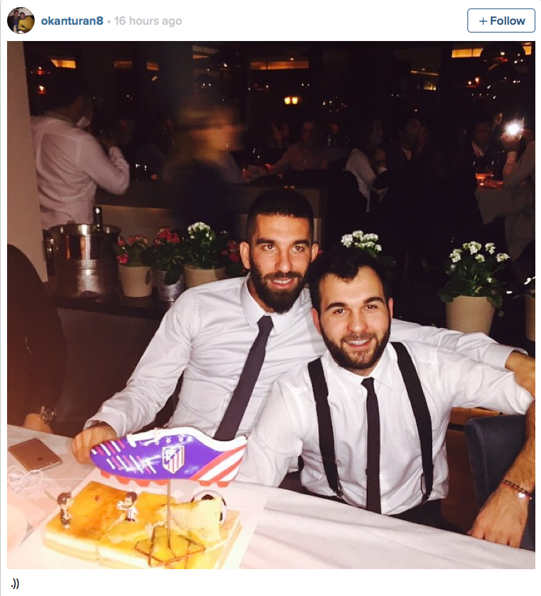Турският полузащитник на Атлетико Мадрид Арда Туран става днес на 28 години. Халфът на "дюшекчиите" стана скандално известен със захвърлянето на обувката си по посока на страничния съдия по време на лудия мач с Барселона в сряда вечер. За рождения си ден днес Арда получи торта, украсена именно с футболна обувка. Снимката беше публикувана от брата на футболиста - Окан Туран, в социалната мрежа Instagram.