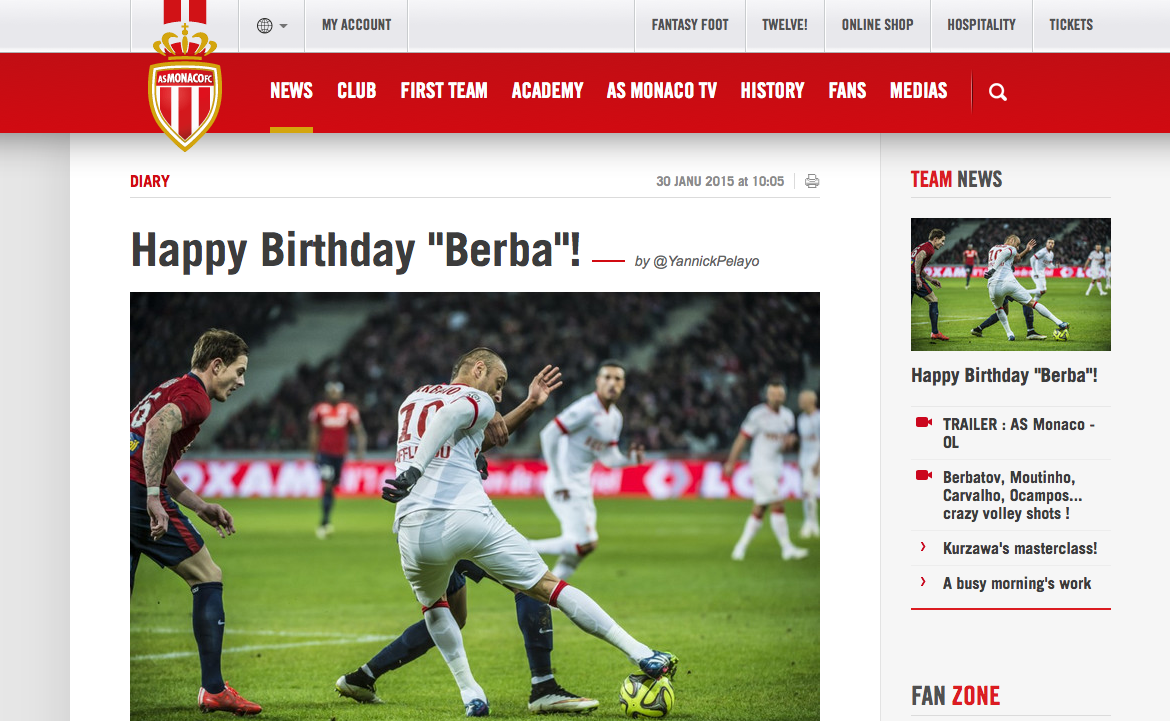 Ръководството на Монако също не забрави да отбележи подобаващо рождения ден на звездата на тима Димитър Бербатов. На официалния сайт на клуба бе публикувана новина със заглавие "Честит рожден ден, Берба!". Освен това там има и специално видео с най-красивите голове на българина, който днес навърши 34 години.