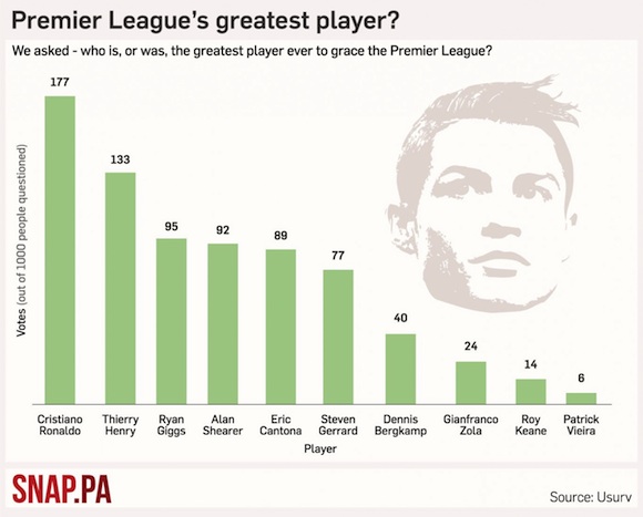 Кристиано Роналдо получи мечтан подарък за днешния си рожден ден. Той беше определен за най-велик футболист в историята на английската Висша лига в допитване сред 1000 фенове от Острова, поръчано от Press Association. В Премиършип CR7 игра за Манчестър Юнайтед от 2003 до 2009 година, с който спечели девет отличия. В анкетата сред онлайн потребители, за които не се казва по какъв точно принцип са били подбирани, Кристиано събира 177 гласа, изпреварвайки Тиери Анри (133), Райън Гигс (95) и Алън Шиърър (92). Гласуващите са можели да избират още измежду Ерик Кантона, Джанфранко Дзола, Денис Бергкамп, Стивън Джерард, Рой Кийн и Патрик Виейра. Повече от една четвърт от взелите участие във вота са посочили отговор "Друг футболист". Ако те бъдат извадени от цялата сметка, Роналдо събира 24% от всички, които са гласували за един от посочените 10 варианта.
