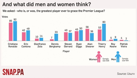 От тези 1000 души, участвали в анкетата, 506 са жени, а останалите 494 са мъже. Само при трима от десетимата футболисти дамите доминират в гласовете - т.е. резултатите на Алън Шиърър, Стивън Джерард и Виейра са съставени от повече женски вот в сравнение с мъжки. При останалите силният пол далеч превъзхожда слабия, като най-видно е това при Денис Бергкамп (33 срещу 7), което показва, че явно холандецът далеч не е любимец на дамите.