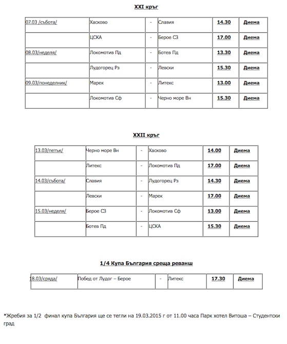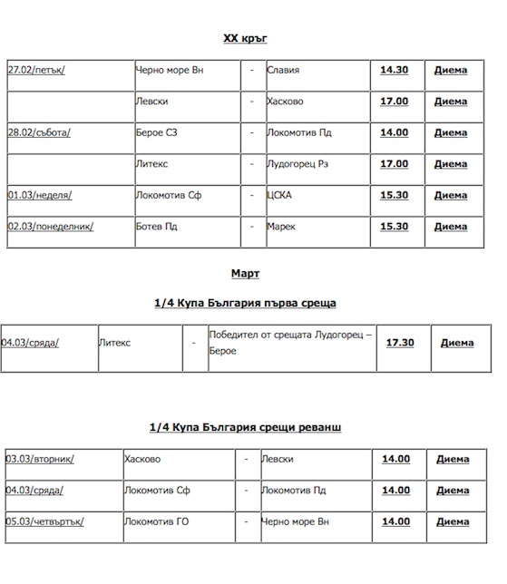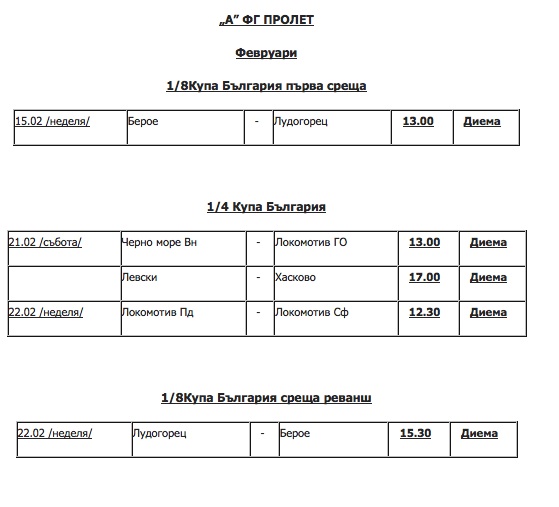 Програмата на "А" група и Купата по дни и часове до средата на март