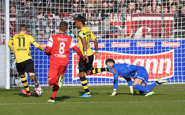 Борусия започна по-добре мача и набързо стигна до откриване на резултата. В 9-ата минута Майк Франтц направи фатална грешка и върна топката неразчетено назад, като на практика я подари на Пиер-Емерик Обамеянг, който веднага подаде на непокрития Марко Ройс, а за него остана само да насочи кълбото в опразнената врата за 0:1.