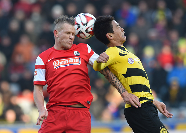 В края на полувремето обаче и играчите на Фрайбург показаха зъби. В 38-ата минута Франц отправи нелош изстрел покрай вратата. В 44-ата минута пък Оливер Зорг отправи истинска бомба по посока вратата на Роман Вайденфелер, който обаче демонстрира блестящ рефлекс и спаси.
