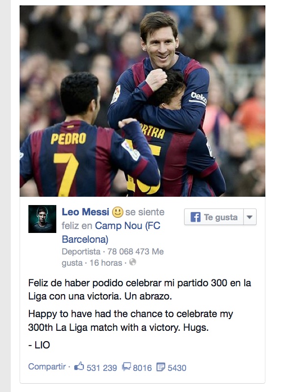 Голмайсторът на Барселона Лионел Меси изрази задоволство от своя мач номер 300 в Примера, ознаменуван с три гола и успех с 5:0 над Леванте. Аржентинският стрелец избра емотикон за щастие, за да сподели емоциите си пред своите симпатизанти във Facebook.