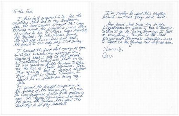Тогава шефовете приеха обясненията на Родригес, но го предупредиха, че трябва да изчисти отношенията си с феновете и медиите преди началото на пролетните тренировки, които се откриват тази седмица. Вместо да организира предложената му от Янкис пресконференция обаче А-Род разпространи следното писмо: