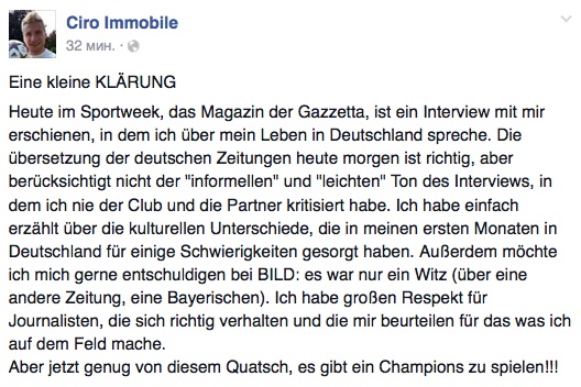 Имобиле се оплака от острите коментари по негов адрес. "Билд" буквално ме разкъса, защото е вестник от Мюнхен, а там не пропускат възможност да нападнат Борусия", коментира италианският нападател, без да е наясно, че в действителност централният офис на таблоида е в Берлин.