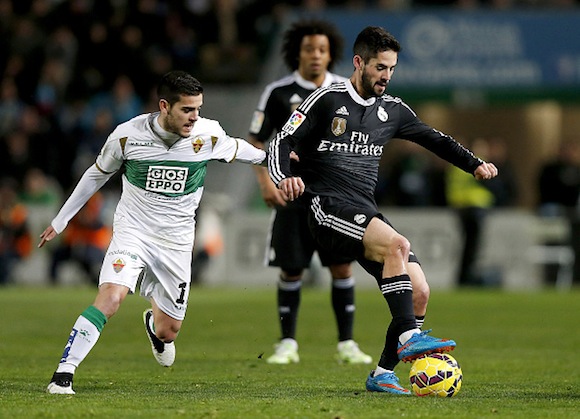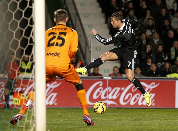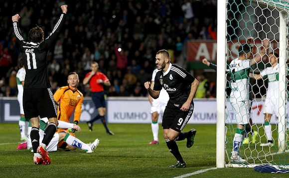 Реал Мадрид победи с 2:0 като гост Елче и увеличи на 4 точки преднината си пред Барселона, след като вчера каталунците сензационно загубиха с у дома от Малага. Карим Бензема и Кристиано Роналдо отбелязаха попаденията за кралския клуб, който цяло първо полувреме не успя да превземе вратата на един от аутсайдерите в Примера. Бензема откри в 56-ата минута, възползвайки се от рикошет в тялото на вратаря Пжемислав Титон, а четвърт час по-късно Роналдо засече с глава центриране на Иско и заби 29-ия си гол за сезона.