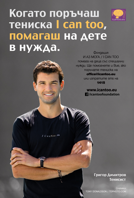 Григор Димитров подкрепи мисията на фондация И АЗ МОГА/I CAN TOO. Най-добрият български тенисист стана лице и посланик на организацията, като се снима с популярната тениска I CAN TOO. По този начин той заявява социалната си ангажираност към децата със специални нужди в България и дава пример как всеки МОЖЕ да помогне и да промени света към по-добро.