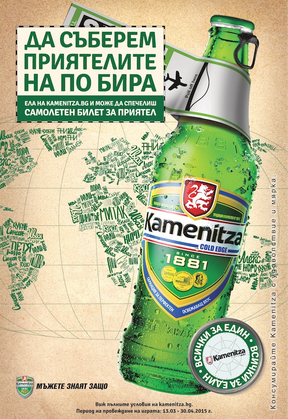 Фразата, с която тримата мускетари на Александър Дюма се обединяват, ще действа като движеща сила и в рамките на кампанията на Kamenitza. Преди броени дни първата бира на България представи обновения си уебсайт kamenitza.bg като основна платформа, която ще позволява на българи по цял свят да се съберат „на по бира“. За да си осигурят възможността да спечелят една отдавна чакана среща с най-близките си приятели, единственото, което любителите на бирата е необходимо да направят, е да влязат в сайта и с няколко бързи клика да изберат 1 от 3 видео послания, което считат за най-подходящо за своя близък в чужбина, да го персонализират и изпратят. Колкото повече приятели участват за един свой близък, толкова по-голям е шансът да го върнат в родината, за да изпият по студена Kamenitza заедно. С тези няколко лесни стъпки, всеки желаещ ще може да участва в томболи за спечелване на 1 от 20 двупосочни билета за свой приятел в чужбина, както и за допълнителни награди – 3 скутера Peugeot Vivacity и 300 комплекта по 6 специални чаши Kamenitza.