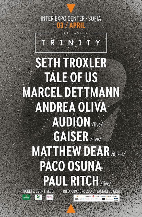 Тази седмица, 3 април, SOLAR EASTER T R I N I T Y ще представи две зали с две отделни независими програми, които включват изключително прецизен и качествен подбор на най-актуалните и добри артисти от световната техно сцена. Акцент във FLOOR 2 e MARCEL DETTMANN, който заедно AUDION, PAUL RITCH, MATTHEW DEAR, GAISER, PHILIP CHERNIKOV ще се погрижат за техно музиката да изпълни INTER EXPO CENTER. В тази приятна задача ще се включат още SETH TROXLER, TALE OF US, PACO OSUNA, ANDREA OLIVA и VALDY oт FLOOR 1.
