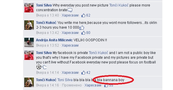 Тони Силва: Моята Фейсбук страница е лична Тончи Кукоч и не съм публично момче като теб. Затова и фейсбукът ми е личен, снимките ми са лични. Но ти не можеш да живееш без Фейсбук, всеки ден имаш нов пост. Съсредоточи се върху футбола.