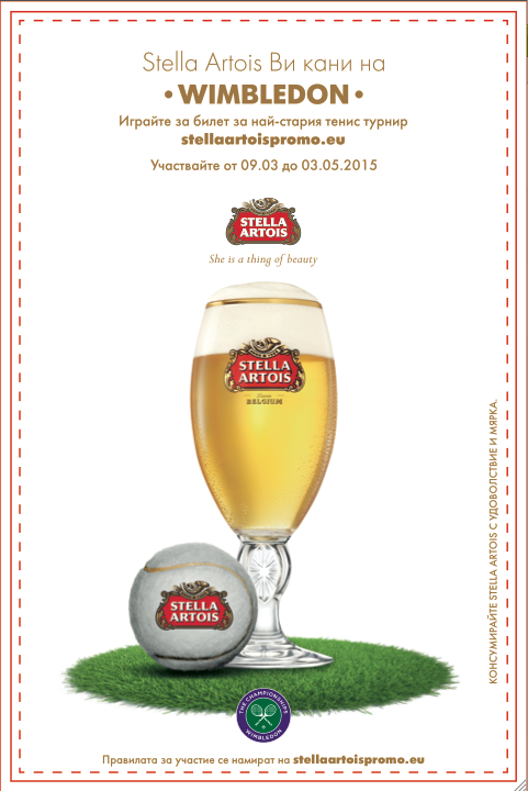 Тази година Stella Artois отново ще подкрепи най-популярния тенис шампионат и желае да покани всички познавачи на Wimbledon да се присъединят. За целта Stella Artois организира промоция, благодарение на която осем от Вас ще могат да посетят мач от тазгодишното издание на най-стария тенис турнир. Освен това Stella Artois ще зарадва и много други ценители с награди – тенис ракета от Stella Artois, комплект брандирани тенис топки и специален лимитиран бокал Wimbledon. Всичко за промоцията можете да откриете на stellaartoispromo.eu.