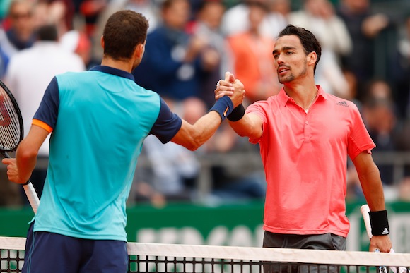 От този момент до края на сета двамата тенисисти взимаха без проблеми сервисите си. Единствено при 4:2 пред Фонини се откри добра възможност за нещо повече. Той поведе с 30:0 при сервис на Димитров, но все пак Григор спечели четири поредни точки и не допусна грешка като дори ядоса доста съперника си, който след третата такава хвърли ракетата си на корта. Впоследствие резултатът набъбна до 5:3, а сервирайки за спечелване на първата част, Григор набързо поведе с 40:15 и завърши сета след едва 30 минути игра.