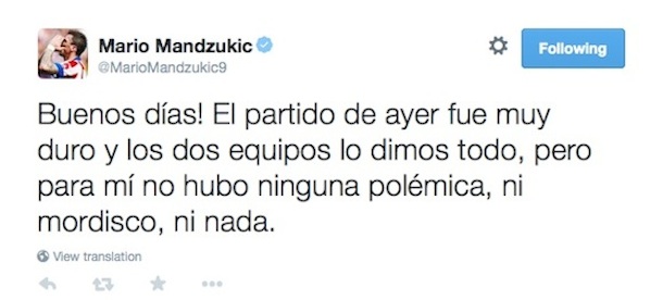 Нападателят на Атлетико Мадрид Марио Манджукич сложи край на полемиката дали е имало захапване от страна на Даниел Карвахал по време на снощното дерби с Реал Мадрид. "Добър ден! Вчерашният мач беше много тежък, двата тима дадохме всичко, но за мен нямаше никаква полемика, нямаше захапване, нямаше нищо", написа хърватският стрелец в Twitter.