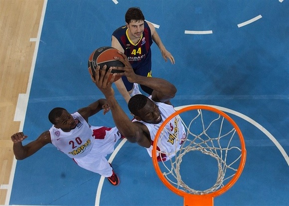 В същото време в "Палау Блауграна" в каталунската столица Барселона се наложи лесно над Олимпиакос. Домакините взеха добър аванс още след края на първата четвърт, която спечелиха с 20:8. Интрига в срещата липсваше почти през цялото време, което позволи на треньорите на двата тима да пуснат в игра всичките си състезатели. Най-резултатни в срещата бяха Хуан Карлос Наваро и Босчан Нахбар, които вкараха по 10 точки за домакините.