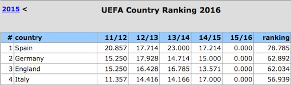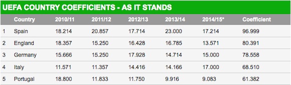 Друг притеснителен за английските отбори факт е, че заради начина на отчитане на коефициентите от страна на УЕФА в рамките на последните пет сезона, Англия ще загуби най-добрата част от своя резултат. Това е сезон 2010/11, когато отборите от Висшата лига са натрупали 18.357 точки към своя коефициент. За Италия пък тази кампания е една от най-слабите в рамките на последните пет години, като тимовете от Серия "А" са натрупали едва 11.571 точки през този сезон. При отпадането му италианските клубове ще се доближат чувствително до клубовете от Англия.