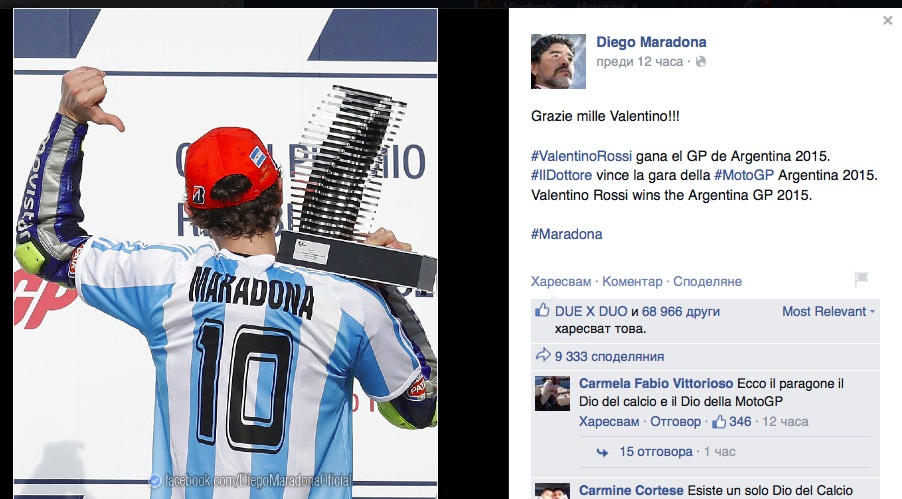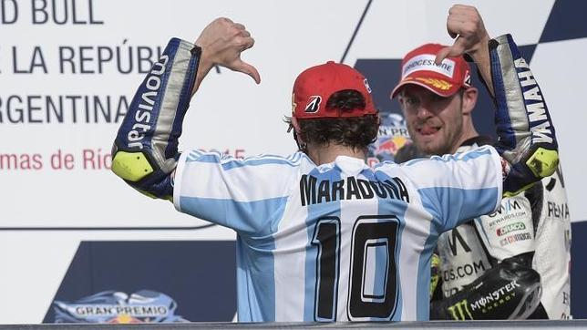 Легендата на аржентинския и световeн футбол Диего Армандо Марадона остана трогнат от жеста на деветкратния световен шампион по мотоциклетизъм Валентино Роси. Вчера 36-годишният италианец спечели Гран при на Арженитна и поведе в генералното класирането след втората си победа от три старта за сезона. Доктора се появи на почетната стълбичка с фланелка на "гаучосите" с номер 10 на гърба и изписано името на Марадона, което подлуди местните фенове на пистата.