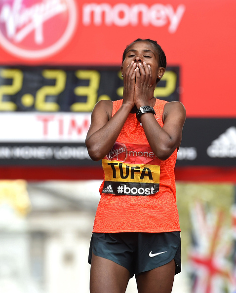 Тигист Туфа стана първата етиопка с победа в маратона на Лондон от 14 години насам. 28-годишната лекоатлетка финишира с време 2:23:22 минути, с което прекъсна серията от четири поредни успеха на кенийските си съпернички. Двукратната победителка Мери Кейтани от Кения остана на 18 секунди зад Туфа, докато Тирфи Цегайе от Етиопия завърши трета.