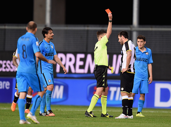 В 40-ата минута тимът на Удинезе остана с 10 души на терена. Защитникът Маурицио Домици получи втори жълт картон и бе отстранен от игра.