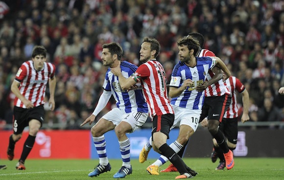 Отборите на Атлетик Билбао и Реал Сосиедад направиха 1:1 във великото баско дерби от 34-ия кръг на Примера, играно на "Сан Мамес". Ариц Адурис откри за домакините в 52-ата минута от дузпа. Алберто де ла Бейя изравни в 60-ата минута. Билбаинският тим не се възползва от това, че игра с човек повече около 40 минути след спорното изгонване на Микел Гонсалес. Така Атлетик не успява да спечели шести пореден градски сблъсък загуби ценни точки в битката си за евроместата. Съставът на Дейвид Мойс ще доиграва спокойно сезона, като до момента има 40 точки.