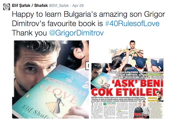 Световноизвестната турска майсторка на перото Елиф Шафак се похвали чрез своя профил в "Туитър" с факта, че Григор Димитров чете нейните книги.