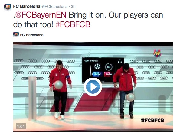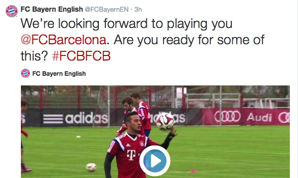 Два дни преди сблъсъка в полуфиналите на Шампионската лига Байерн (Мюнхен) и Барселона водят психологическа война. Днес по обяд германците хвърлиха ръкавица към опонента си, публикувайки в своя профил в "Туитър" видео с технични отигравания на Тиаго Алкантара. Изборът на баварците едва ли е случаен, тъй като испанецът беше привлечен точно от редиците на каталунците. "Очакваме с нетърпение мача с вас. Готови ли сте за това?", обърнаха се мюнхенци към колегите си от "Камп Ноу".