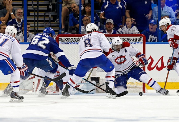 Кари Прайс спря 22 удара, а Макс Пачорети вкара гол и записа две асистенции при победата на Монреал с 6:2 над Тампа Бей. Този мач върна Канадците сред "живите", след като Светкавиците бяха повели с три победи срещу нула и бяха домакини на срещата, смятана за финална в серията. Пачорети и Андрей Марков вкараха голове за Монреал през първата третина, с което дадоха тон за първата победа на Монреал от деветте мача на отбора срещу Тампа Бей през сезона. Канадците са домакини на петата среща и страстните фенове в Монреал ще очакват единствено победа от своя тим, борещ се за спасение на сезона.