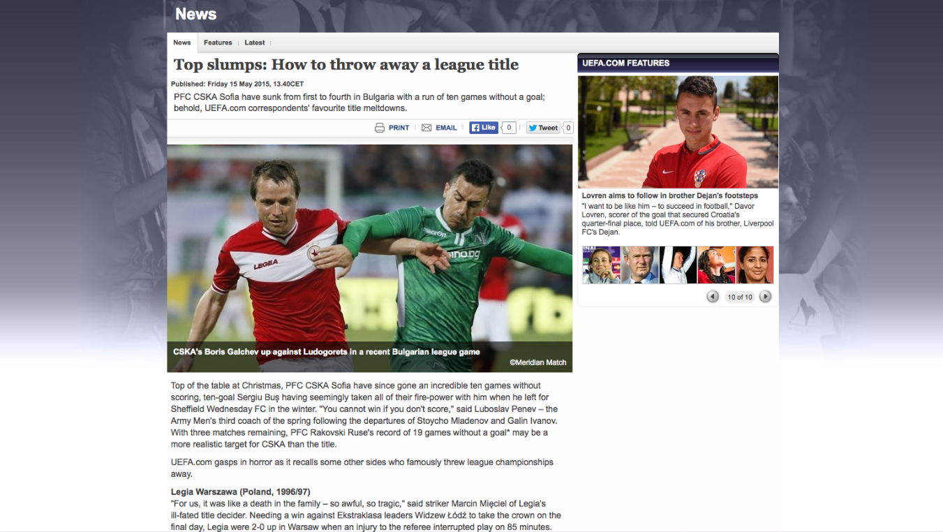 Материалът е озаглавен по следния начин: "Топ спадове: Как да изхвърлите титлата", а под него е допълнено: "ЦСКА потъна от първи до четвърти в България след серия от 10 мача без отбелязан гол".