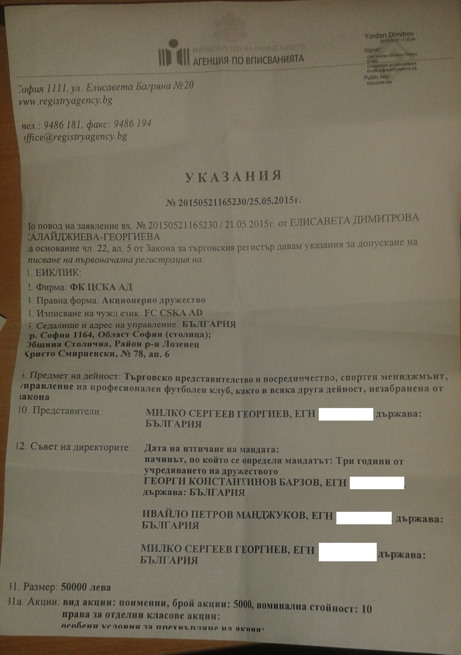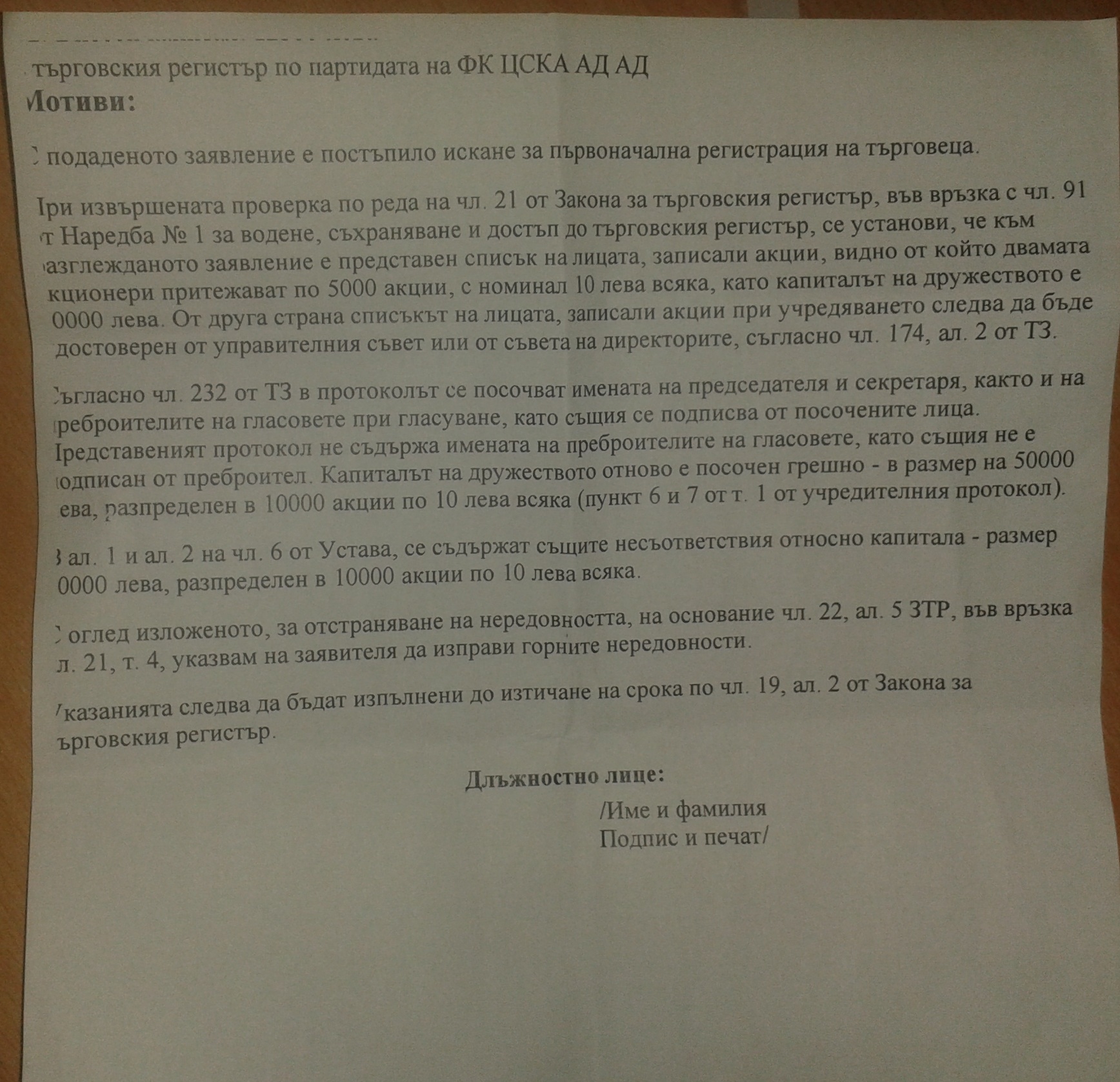 На 25 май 2015 година от ТР са отказали регистрация на новото дружество, изтъквайки мотиви, които не би трябвало да са сериозна пречка за въпросните хора да регистрират ФК ЦСКА АД при следващия им опит.